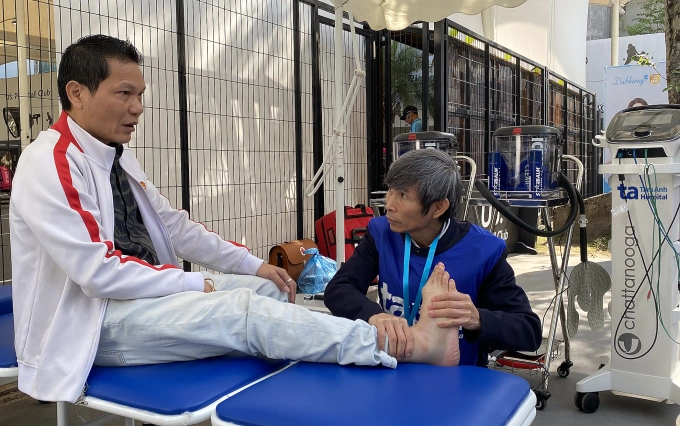 Thạc sĩ Dần khám cho người chơi thể thao bị bong gân. Ảnh: Bệnh viện Đa khoa Tâm Anh