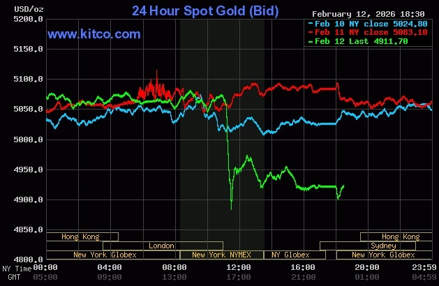 Chốt phiên giao dịch 12/2,giá vàng thế giới giao ngay giảm 162 USD xuống 4.920 USD một ounce. Đây là mức thấp nhất một tuần qua. Sang sáng 13/2,giá hiện còn 4.911 USD.