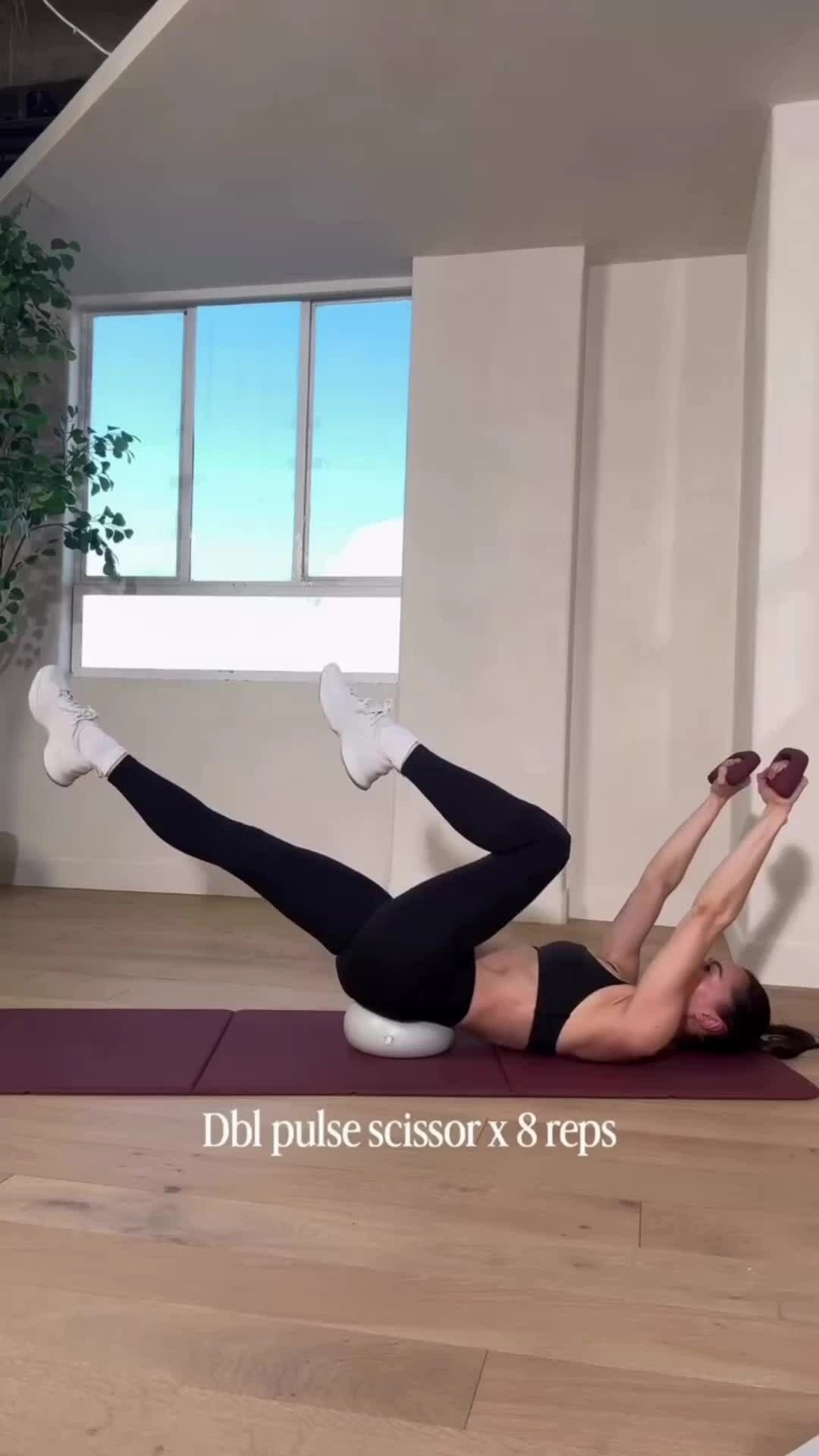 Để tăng độ khó,hãy giữ tạ thẳng phía trên vai. Giữ thắt lưng ép sát xuống sàn và tưởng tượng như bạn đang kéo rốn về phía cột sống.