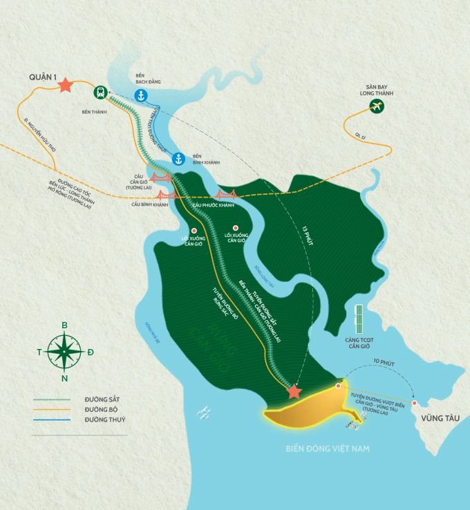 Trong tương lai tuyến đường sắt tốc độ cao Bến Thành - Cần Giờ đi vào vận hành,thời gian di chuyển từ trung tâm TP HCM đến dự án ước tính rút xuống còn khoảng 13 phút. Dự án cầu Cần Giờ thay thế phà Bình Khánh giúp nơi đây tăng khả năng kết nối bằng đường bộ. Bên cạnh đó,tuyến vượt biển Cần Giờ - Vũng Tàu mở ra trục liên kết du lịch mới giữa TP HCM và đô thị biển lân cận. Xa hơn,sân bay quốc tế Long Thành sẽ đóng vai trò cửa ngõ đón khách trong nước và quốc tế,góp phần phát triển cho toàn vùng.