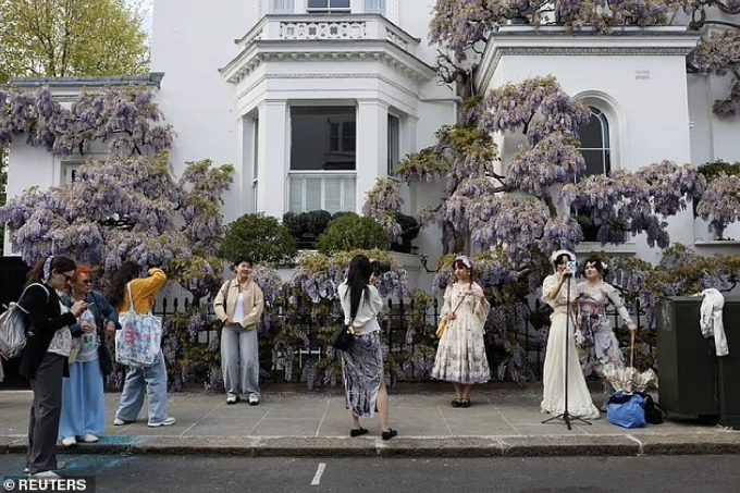 Từng đoàn khách du lịch và người có ảnh hưởng tìm đến một số khu phố giàu có ở Tây London để chụp ảnh cùng hoa tử đằng nở rộ. Ảnh: Reuters