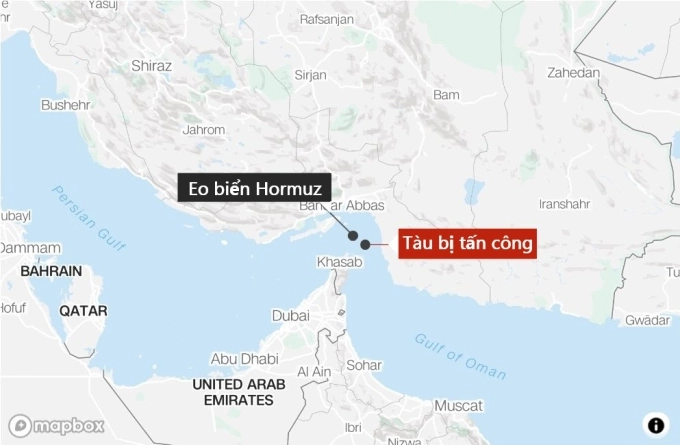 Vị trí eo biển Hormuz và tàu container bị tấn công. Đồ họa: Mapbox